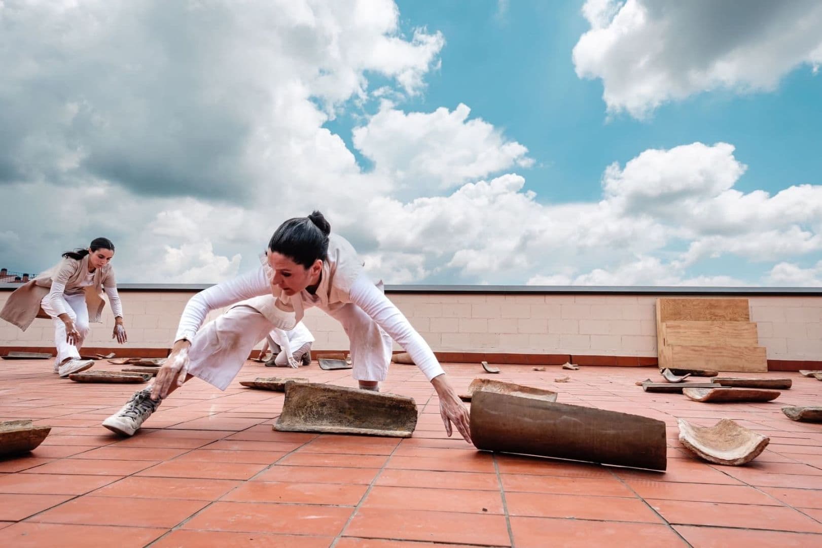 Inspirada en el trabajo manual, “De una en una” combina características del teatro visual, de la danza y del teatro de objeto. A partir de la manipulación de sesenta tejas, tres intérpretes dibujan paisajes visuales y sonoros que responden a un pacto de construcción conjunta. En el silencio crudo de un imaginario rural, entre aspereza, fragilidad y peso, aparece un encuentro entre materia y piel.