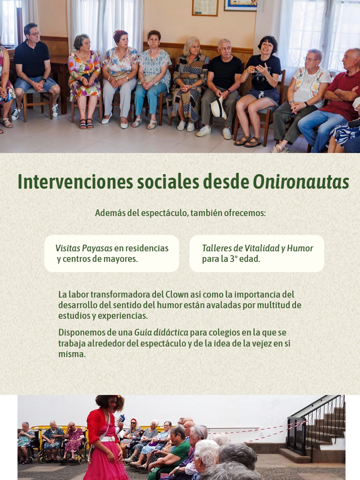 Onironautas: Dícese de aquellas personas que navegan por los sueños. Un cumpleaños. Una barra de pan con tres velas: uno, cero, cero. Una canción. Las últimas horas en la vida de esta centenaria mujer, estarán cargadas de recuerdos, viajes al pasado y sobre todo, de cumplir sueños. Una historia inspirada en muchas historias reales, que deambula entre el recuerdo y la demencia, entre lo vivido y lo soñado. Una crítica a la soledad con la que viven las personas mayores, entregada con el más grande de los abrazos y la más ancha de las sonrisas. Un homenaje a la vejez, cargado de sensibilidad, de emoción y de humanidad, narrado a través del Clown de Natalia Puente. Dedicada a todas las personas mayores que fallecieron en la primavera del 2020.