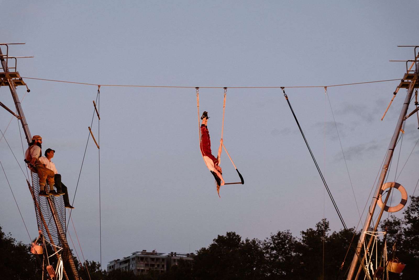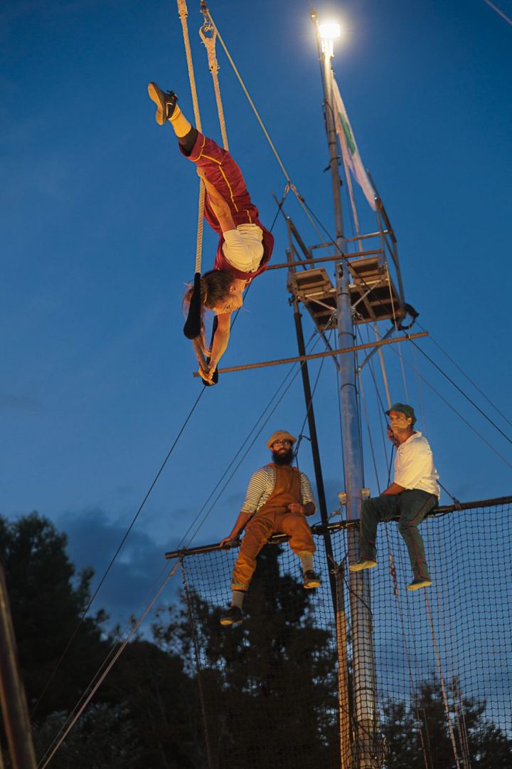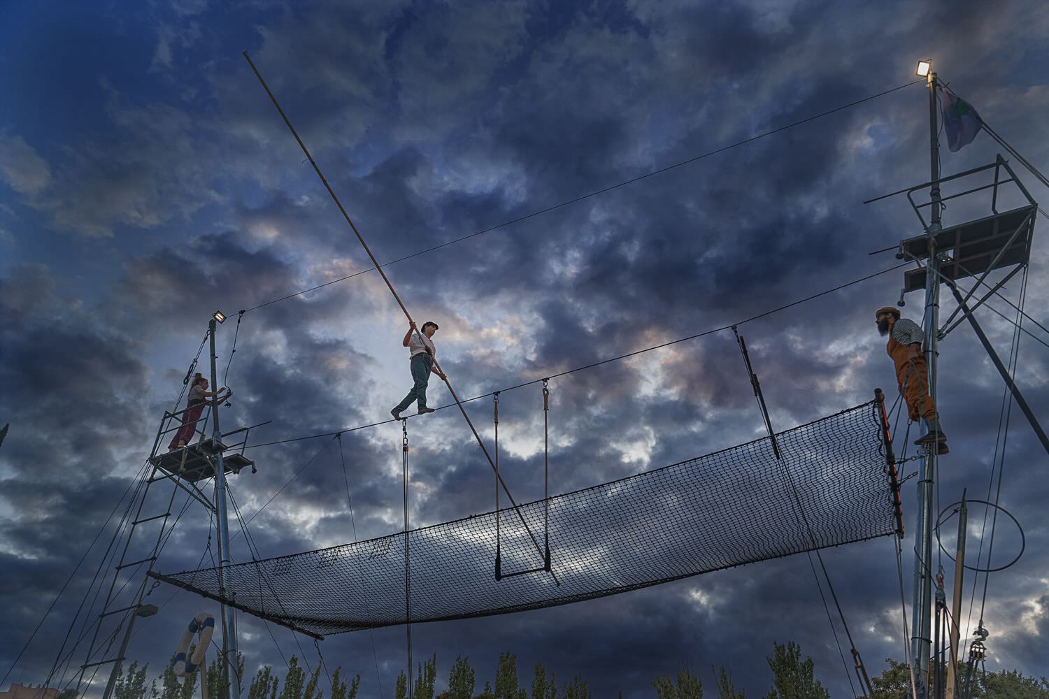 Un puente entre las nubes, un hilo tendido a los sueños, un paso a la ilusión.... 10 metros de cable a 7 metros de altura, un trapecio y un mástil; un funambulistas, dos acróbatas y 2 músicos a medio camino hacia el cielo. Un espectáculo en altura, multidisciplinar, poético y visual para todos los públicos. Una obra para sentir y dar rienda suelta a la imaginación.