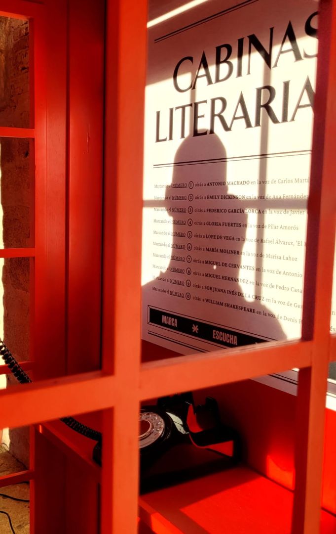 Imagina escuchar a través de un teléfono poemas de Lorca, Gloria Fuertes, Antonio Machado o Emily Dickinson, un fragmento de El Quijote, una entrada del diccionario de María Moliner o unos versos de Shakespeare en inglés... Una experiencia sensorial que te conecta con la literatura y la poesía de manera sorprendente. Tres cabinas telefónicas inglesas en las experimentar un viaje, desde la intimidad de un espacio pequeño y aislado, como si las palabras de los poetas y escritores fueran susurradas solo para ti.