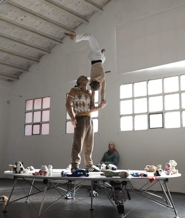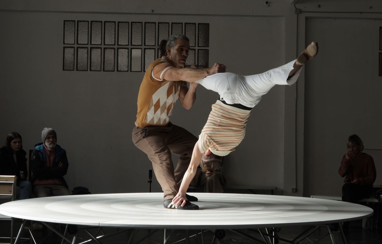 Una plataforma giratoria concebida como espacio vital, desde donde compartimos nuestras vivencias en sus distintas dimensiones: la pareja laboral como acróbatas y artistas, la vida conyugal y el entorno familiar. Con el público dispuesto en 360º, los espectadores se convierten en testigos cercanos de nuestra historia, narrada a través de la voz de nuestra hija y de su propia mirada sobre lo que significa formar parte de esta familia.