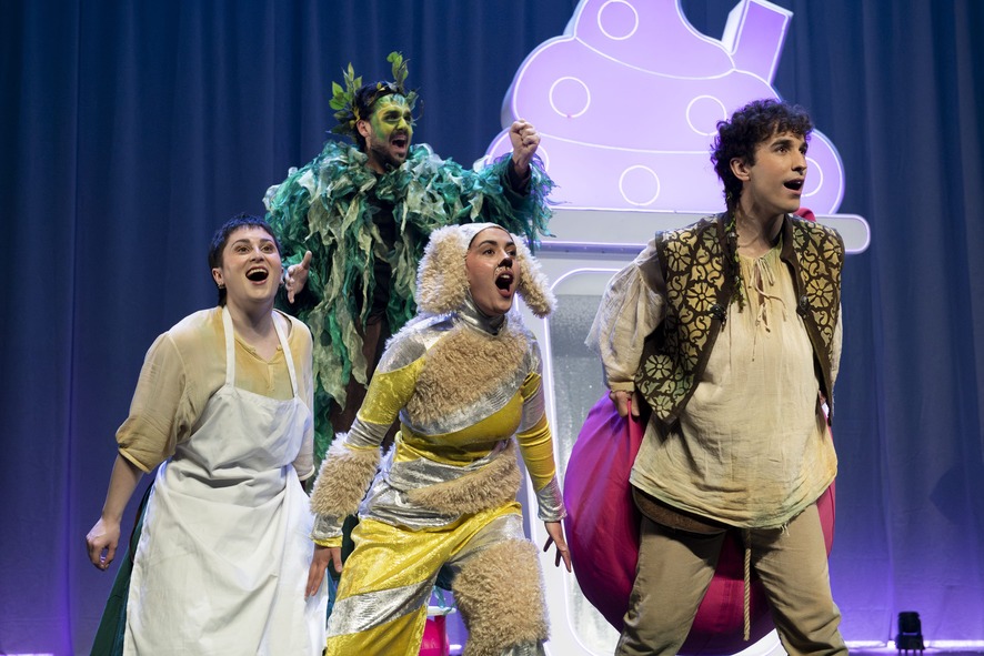 Allí, Hansel y Gretel encuentran una casa fantástica, llena de luces y colores, llena de chocolate, golosinas, música, diversión… ¡y azúcar! ¡Pero es la casa de una bruja encantadora que los hará engordar, engordar y engordar!