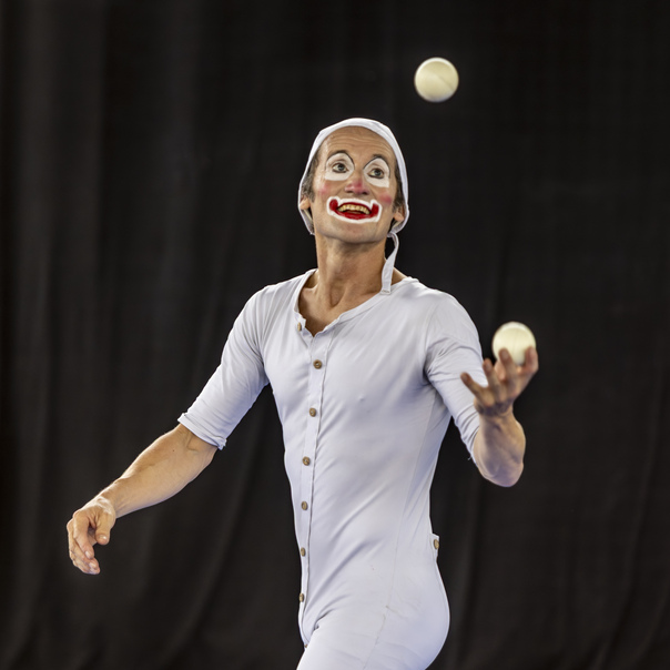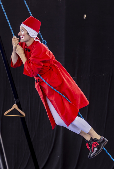 Este payaso, torpe y caótico, presenta a través de la danza, la manipulación de objetos y la acrobacia aérea la posibilidad de transformar ese lastre y usarlo para crecer, para avanzar.